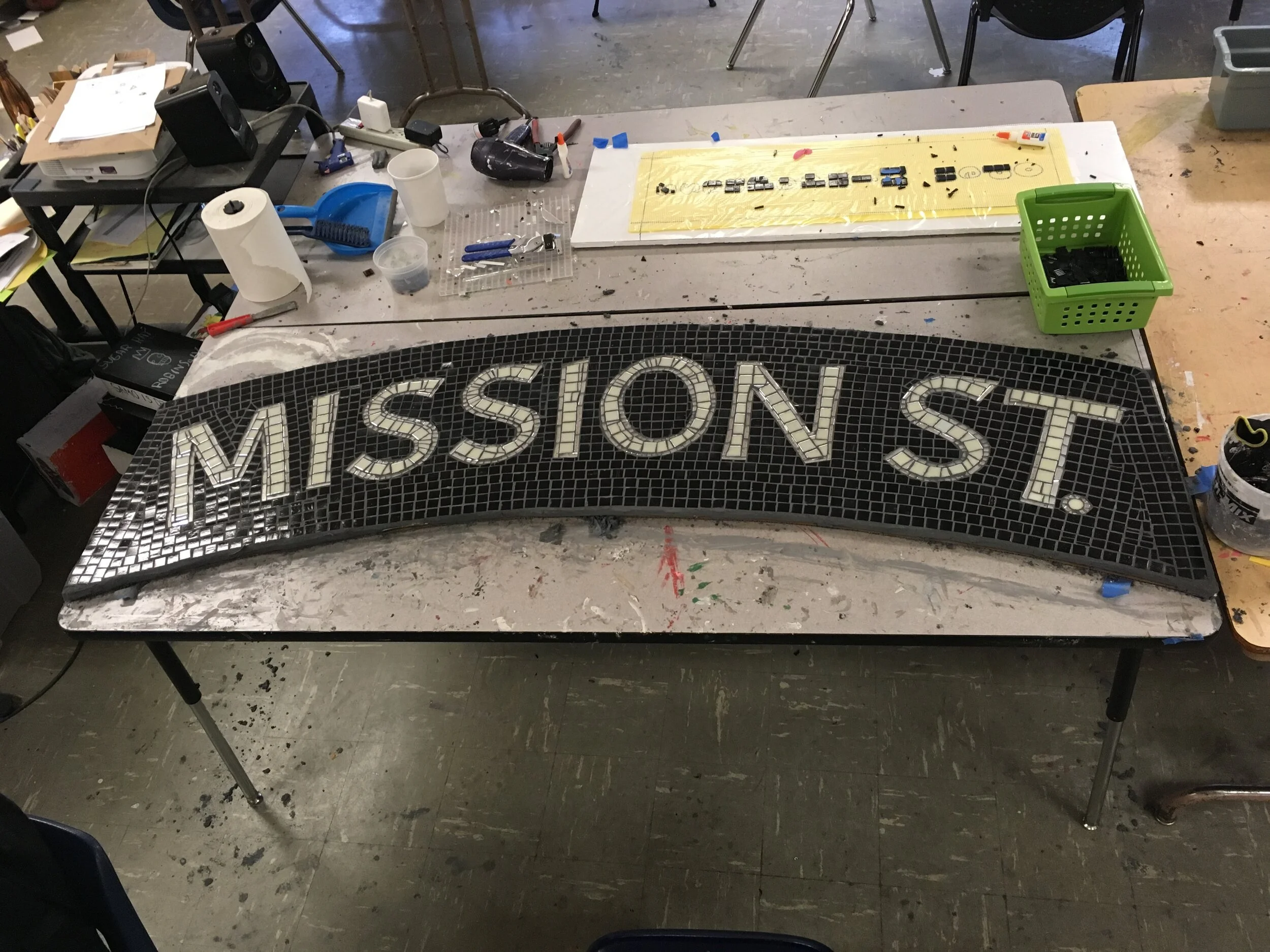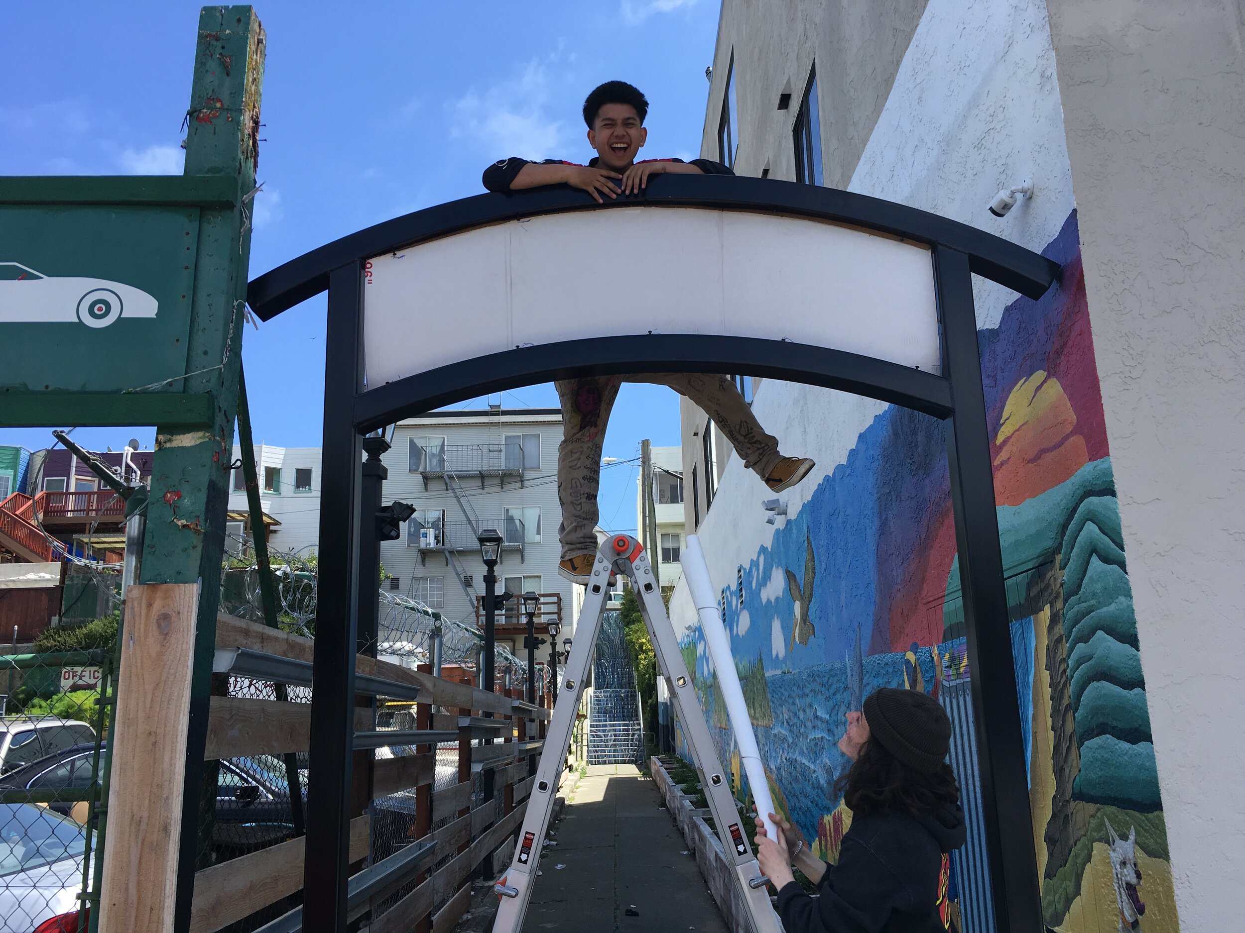 The alley was quite hidden from the street and we wanted the public to notice so we designed a sign to mark the entrance. We paid homage to “Kenny”, a black feral cat that lived in the alley. When I would come by to visit I could call his name and he would come out to say hello. The Mission street side was much simpler but Mission Street was made out of glow in the dark tiles to help with visibility at night.