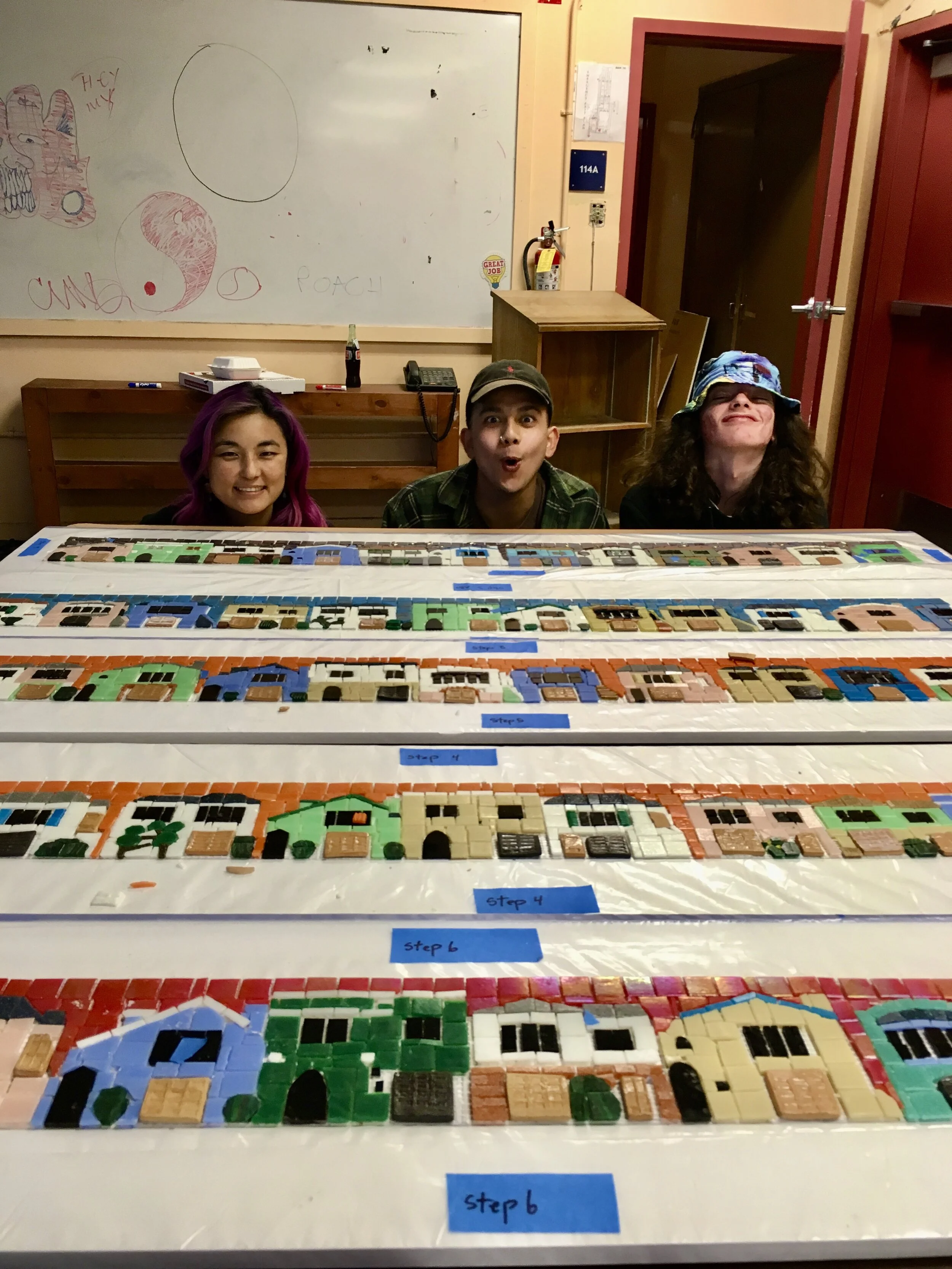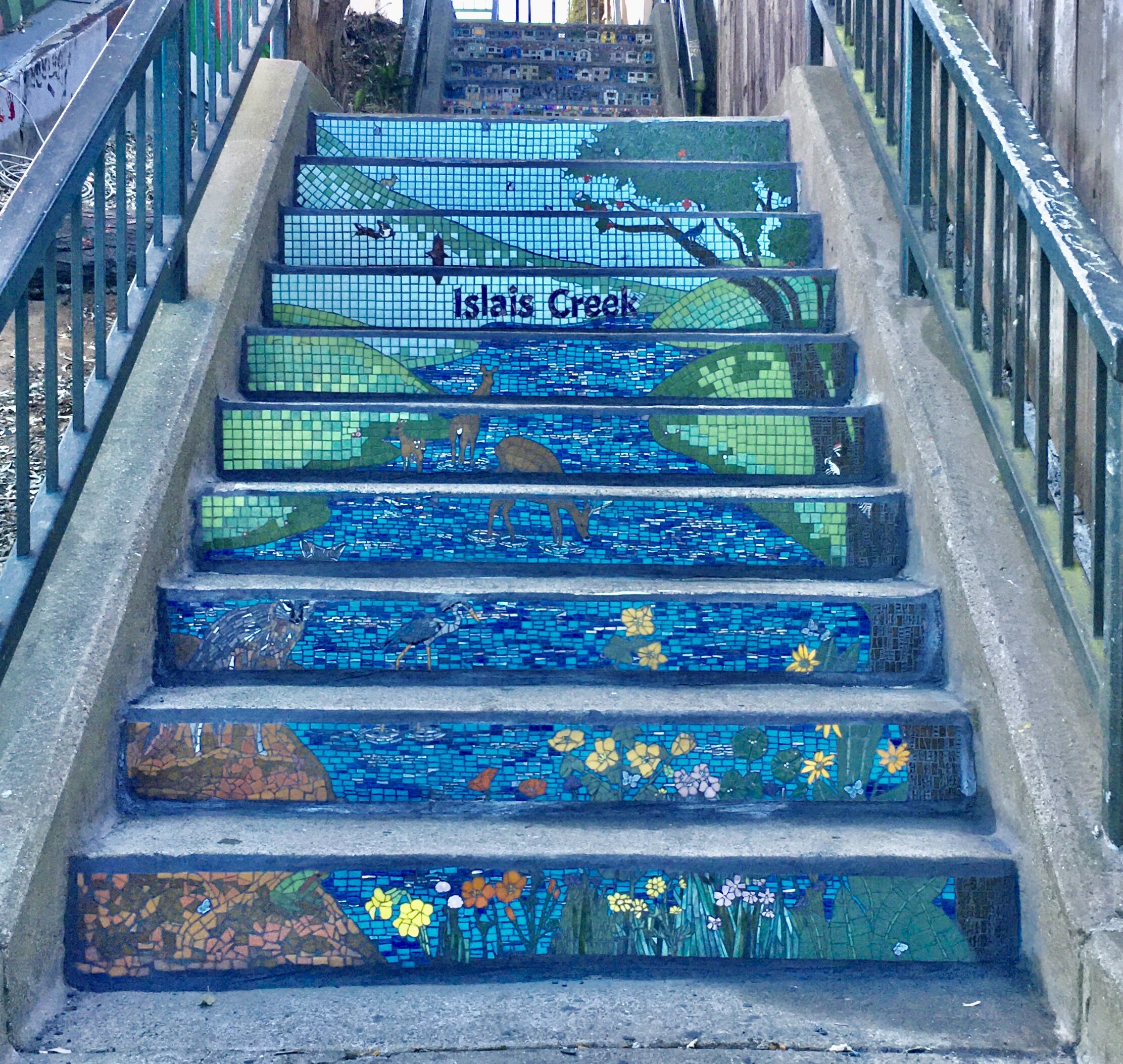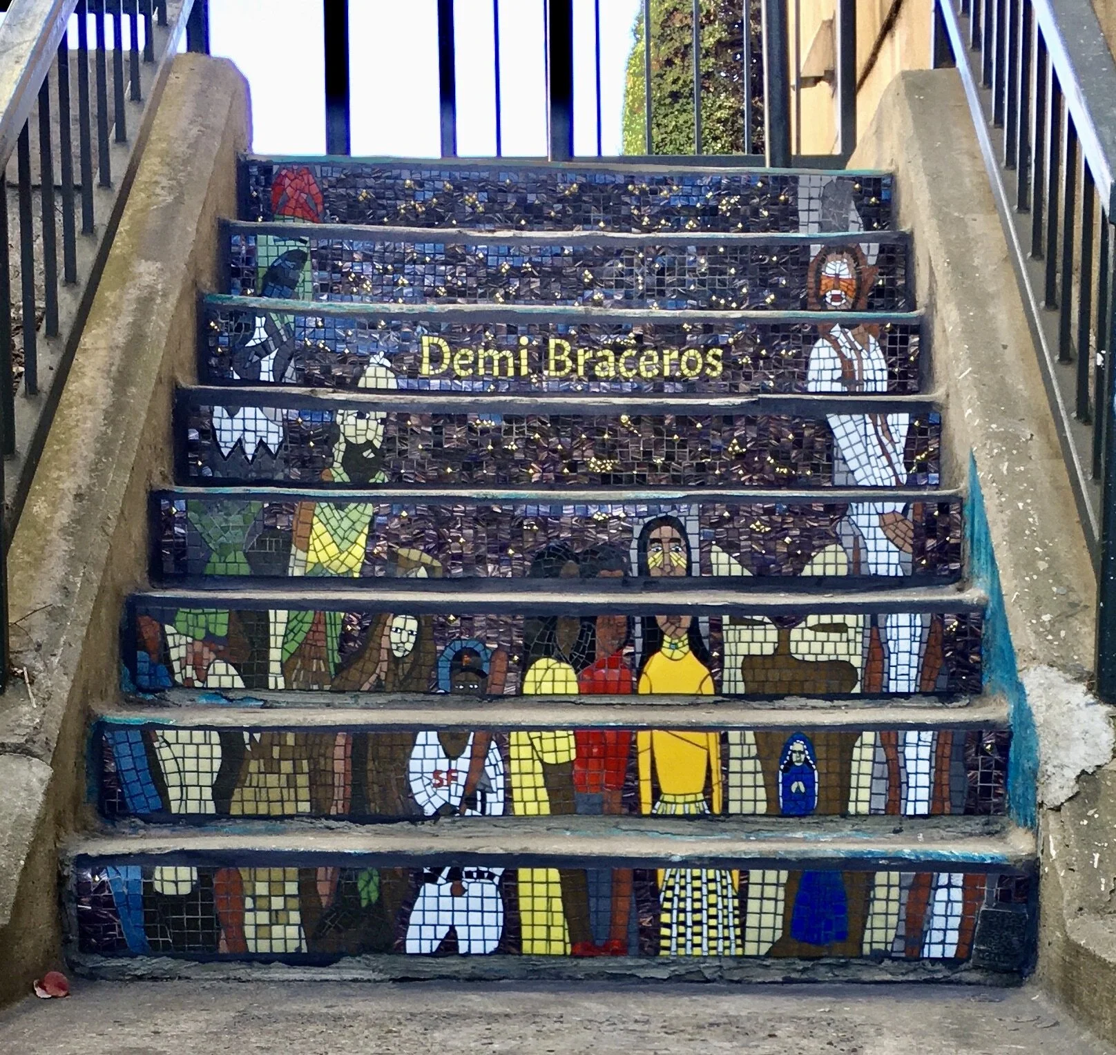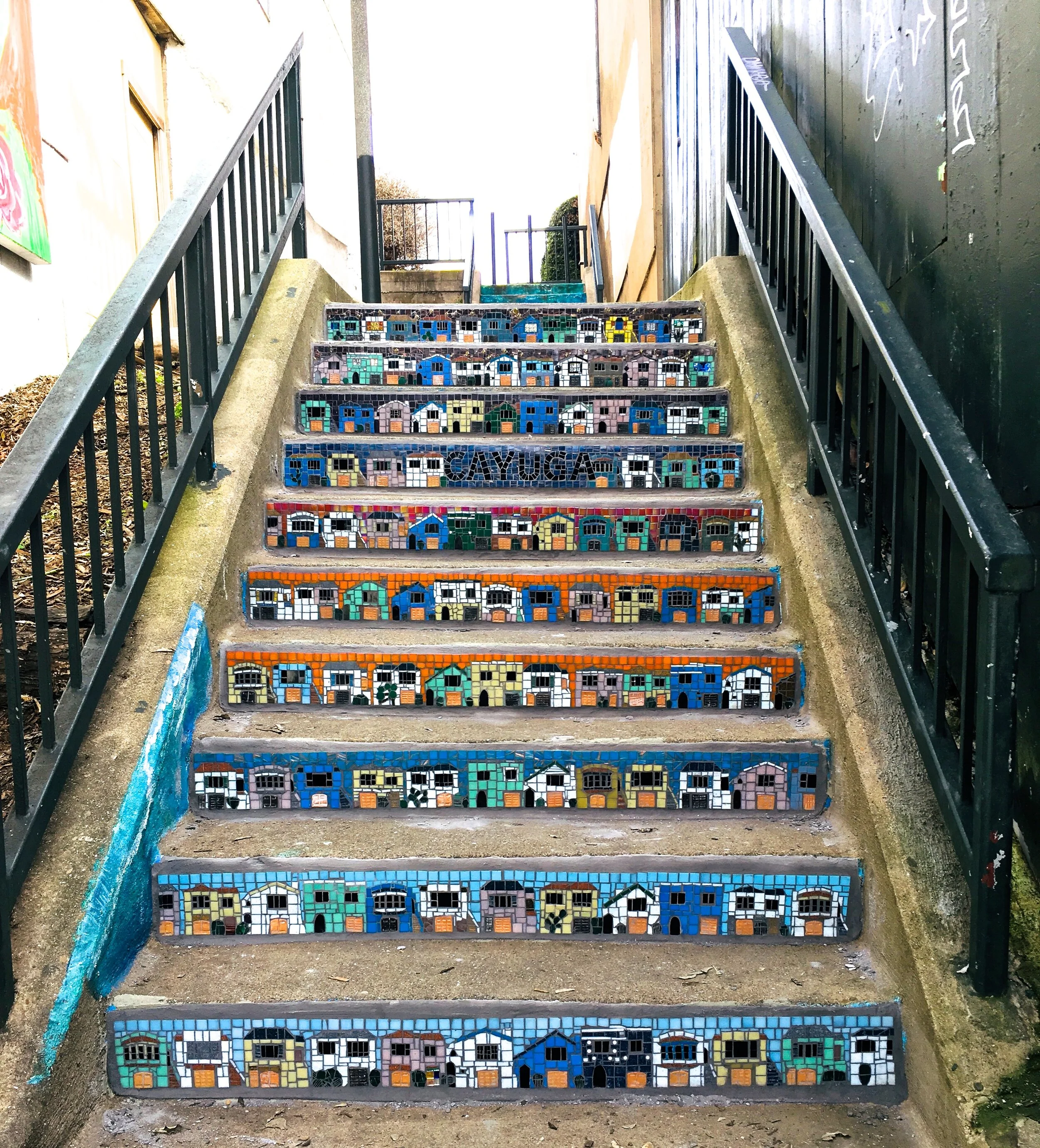 The Cayuga steps are still in progress and will be installed later this month. The first set was to reflect the houses in the neighborhood, the bottom set will pay homage to Islias Creek and the native flora and fauna and the top set will pay homage to the artist and former gardener of Cayuga Park, Demi Braceros.